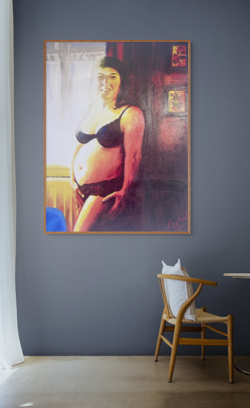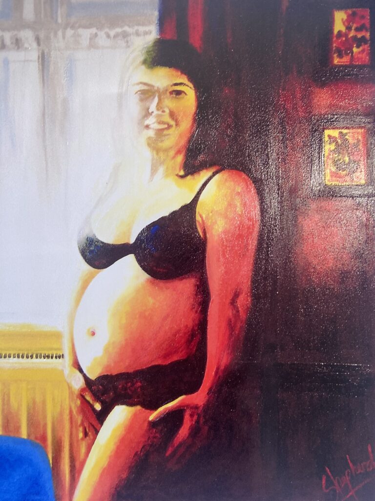 A commission to paint a heavily pregnant Angela. The luminescent light that afternoon as the sun was setting captured the beauty of the moment perfectly. I wanted to respect Angela's modesty and produce something that didn't leave her feeling exposed. She was happy with it and that's all that matters.