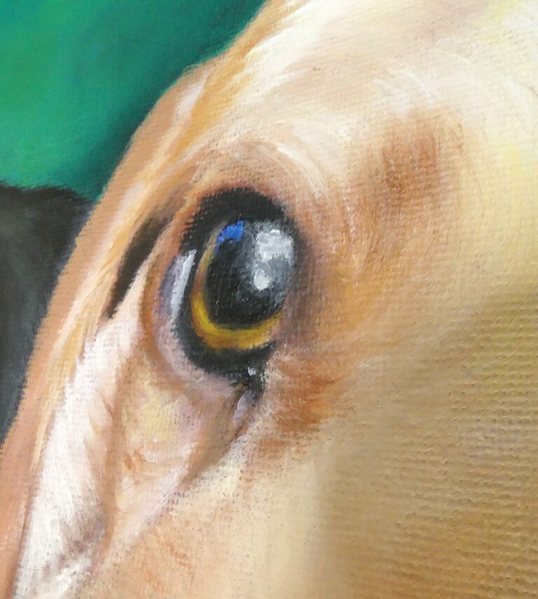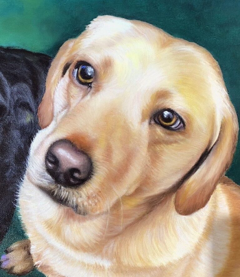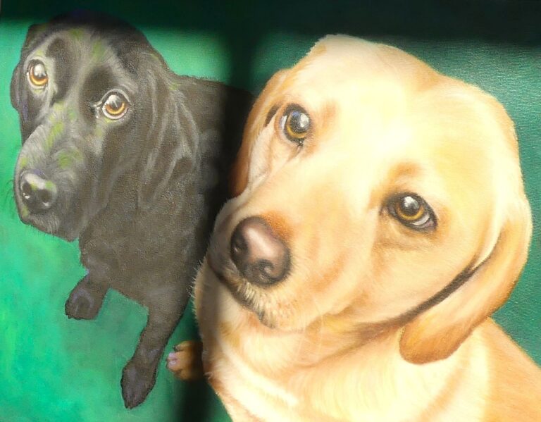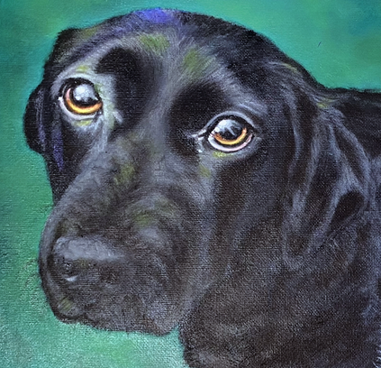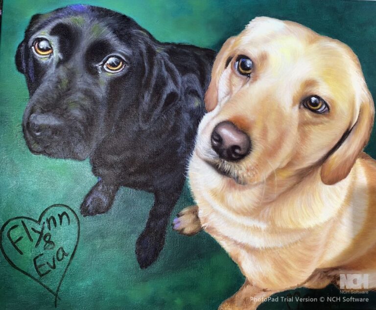 This was a commission to forever imortalize Flynn and his love Eva. When Eva was alive, Flynn was her gentleman looking out for her. When Eva died, Flynn grieved and he cried and wimpered for months afterwards. We wondered if his mounring would ever end. He did eventually cheer up but he was never the same.