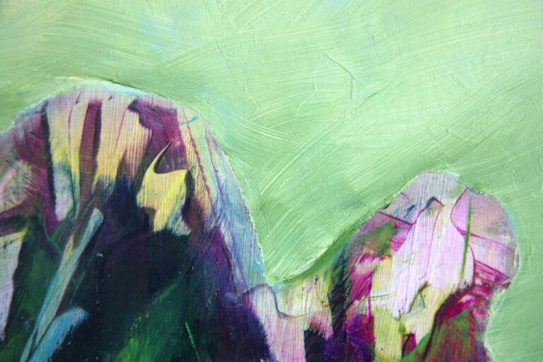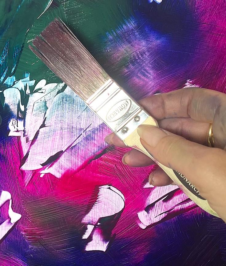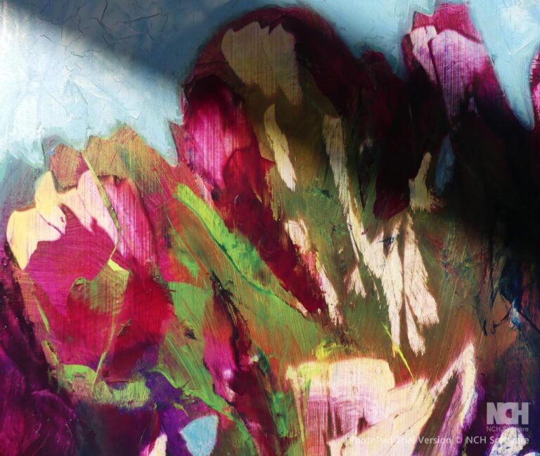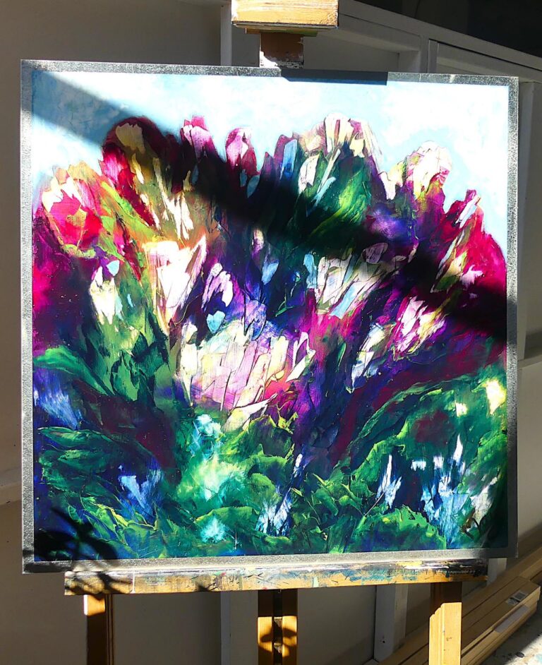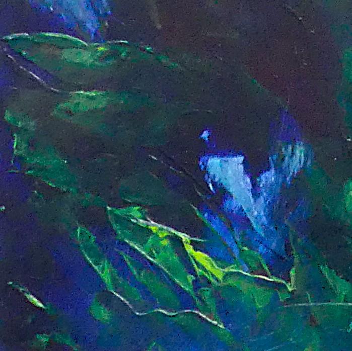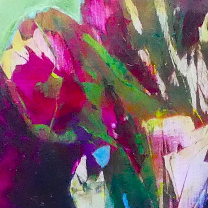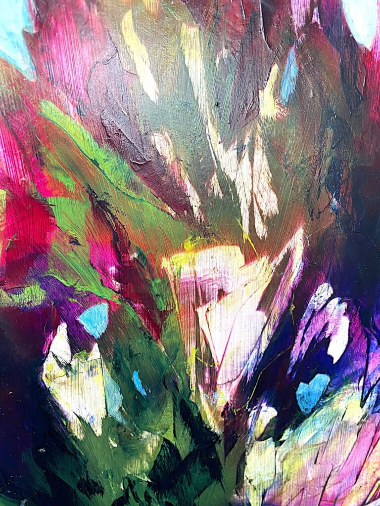 The petals on this bouquet look so silky, you want to touch them. The rich oil paint glides over the aluminium and dries leaving a smooth tactale glaze. Because the paint doesn't soak into the substrate, it maintains it's vibrqancy, and I just love Magenta and Phylo Blue together. The paint was thickly scraped over the panel using a palette knife alla prima. Sadly a real bouquet fades away, but this never will!