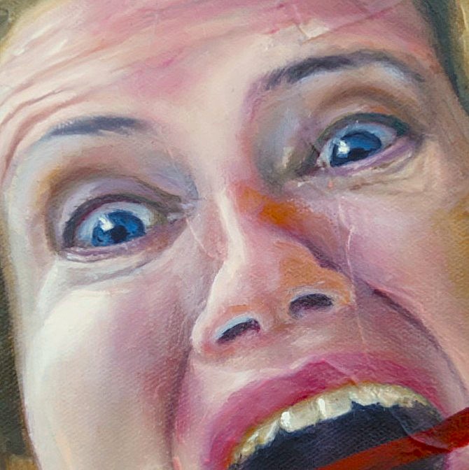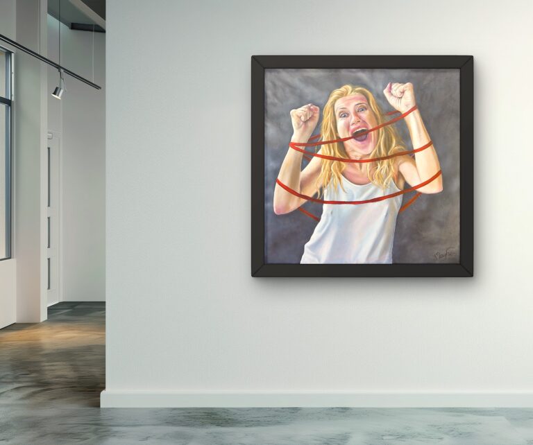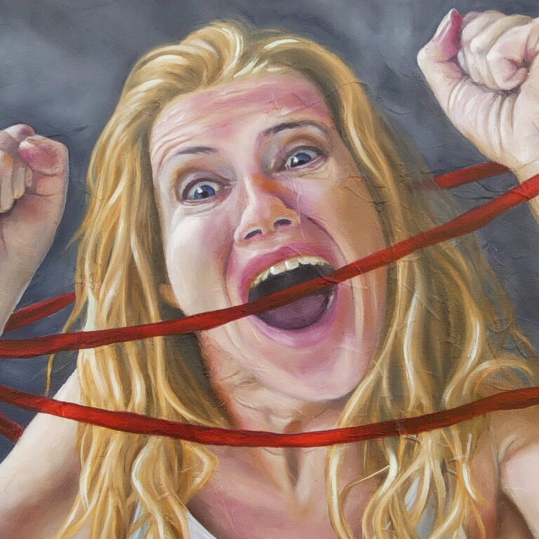 This painting is a self-portrait and I expect a little disturbing. I have always had a resistance to bureaucracy. No matter what one does in life and no matter how hard you try not to get caught up in red tape, it is inevitable that you will. We have created a monster, and the red tape is getting tighter. It's like death by a million papercuts and it removes us further and further away from the natural world. Living between Europe and Australia it became acutely apparent how the world is not set-up for people with flexible lifestyles. Governments are set-up for people living in one place for taxes of course. I understand that they need to keep track somehow, but with so many digital nomads these days, they need to catch-up.