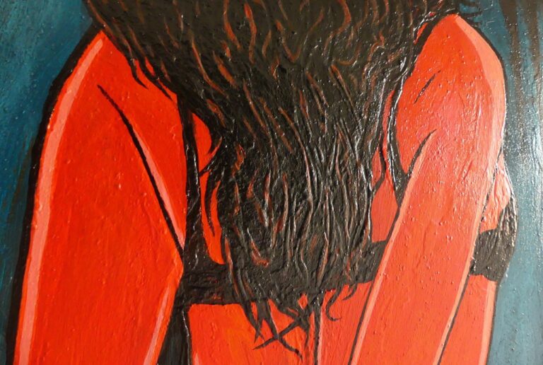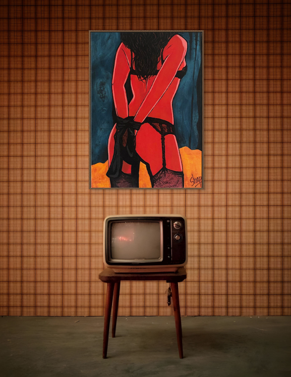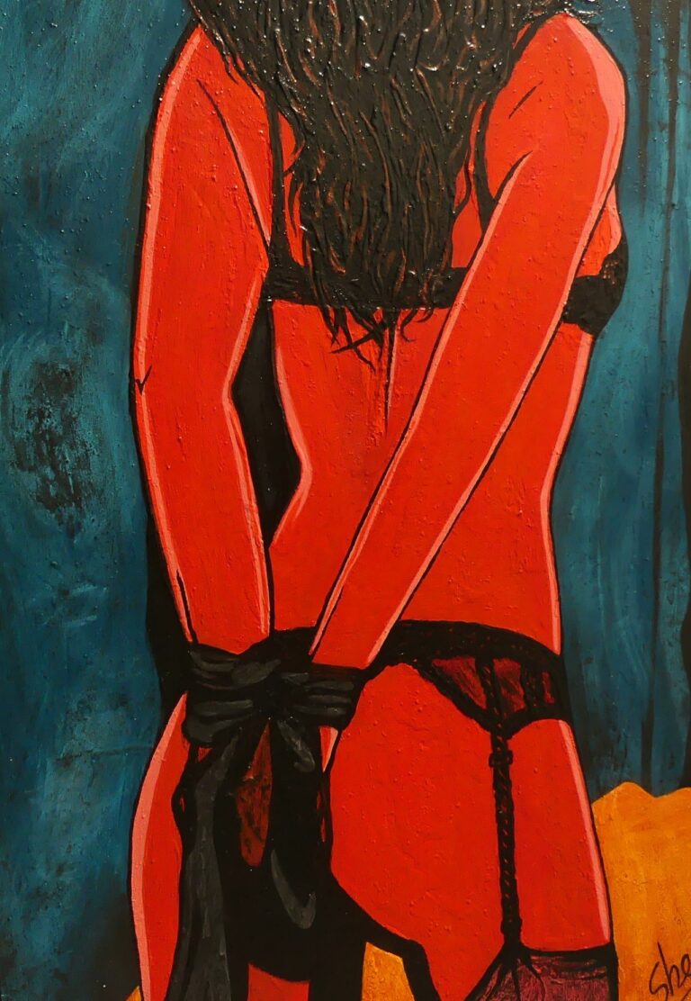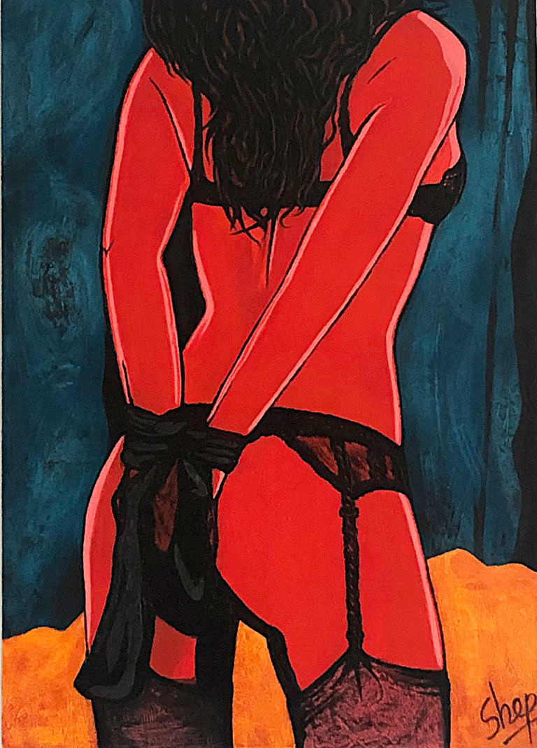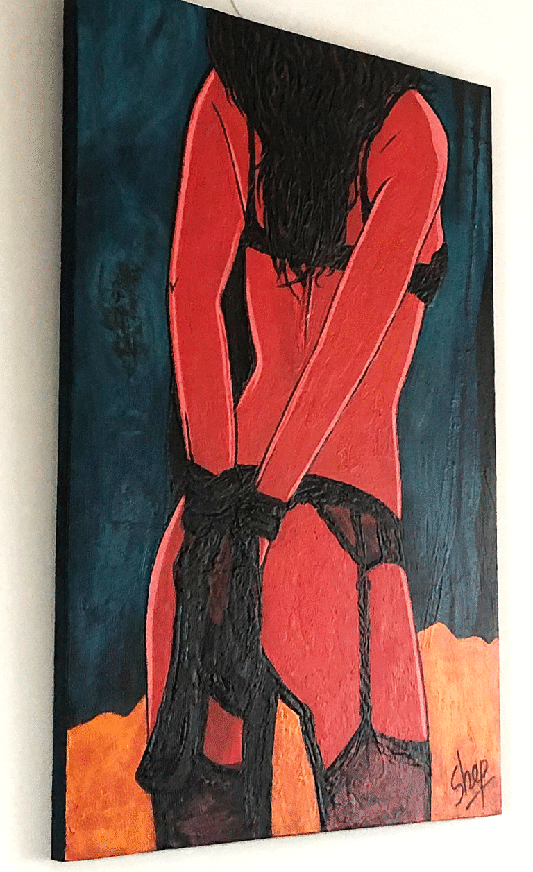 This was painted on commission for a gift, then the couple broke up. Lust is fleeting, buyer beware... It was painted with roll play in mind, the teal blue velvet of the curtains, the black silk of the wrist ties and the red light on the flesh. A little pop-arty, and a little fun!